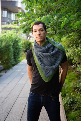 Leitmotif is a large, drapey triangle shawl featuring an all-over double eyelet diamond pattern. The center portion of the shawl is worked flat from the bottom up, with the border knitted on and worked in the round to finish.