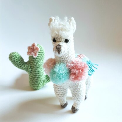 With this simple crochet pattern you can make a super cute amigurumi Llama. He's dressed up for the party, with three colored pompoms around his neck, and a striped blanket-saddle on his back.