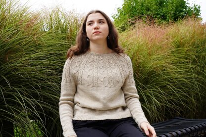 Lennon is a top-down circular yoke pullover featuring an undulating lace pattern separated by lines of small circular cables. Situated together, these two stitch patterns create an interesting and fun knitting experience. The sweater is entirely seamless with a stockinette stitch body, and lace at the sleeve cuffs. Lennon is worked top down in the round with a few short rows to elevate the back neck. Instructions for the stitch patterns are provided in both chart and written formats.