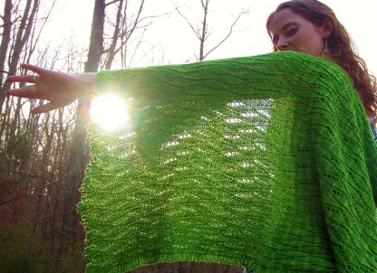 Spring means the return of the leafy greenery, bright sunshine, and just enough chill left in the air to require a shawl. What better shawl than this bright, springy lace swath which echoes the season that inspired it? Its simple rectangular shape and surprisingly memorizable lace pattern will knit up quickly, but with enough flair to impress even the most picky of observers.