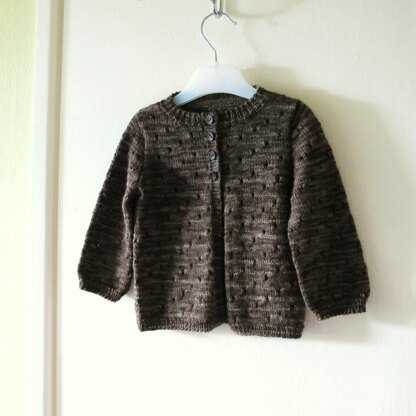 This cardigan is knit from the bottom up, then the shoulders are joined and the sleeves are picked up and knit from the top down, in the round.