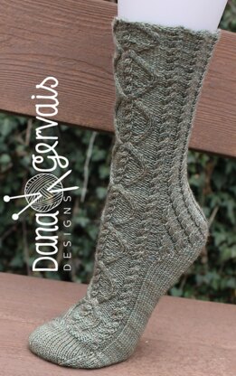 Lerwick is a fully cabled sock that features a cable panel starting at the top of the leg and continuing down to the toe of the sock. The back of the leg features cabled ribbing. The heel is uniquely constructed; the heel flap and gussets are worked simultaneously which allows for the cable pattern to continue on the heel flap and the gussets. The sock finishes with a rounded toe that is grafted closed using Kitchener stitch.