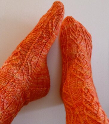 Les Arts Déco Socks feature a modern take on a traditional twisted-stitch stocking. Use a solid or a semi-solid yarn in a lighter color to best display the intricate twists and turns!