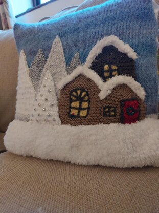 Let it Snow! Christmas cushion cover created in DK yarn. The cover is knitted in one piece and the snowy scene is made from knitted shapes applliqued to the front.