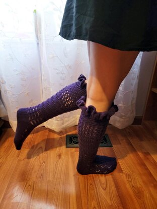 Are you in need of some statement piece knee-high socks? These socks with their eye-catching ruffled edge and a selection of beautiful lace patterns fit the bill! They come in six sizes from child to adult, with options for heel and toe and needle-neutral charted and written instructions. A mid-calf version is also available!