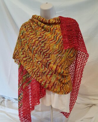 This wrap is worked from the center out, starting with a provisional cast-on. Its length and width can both be adjusted by changing the number of repeats of stitches and rows.