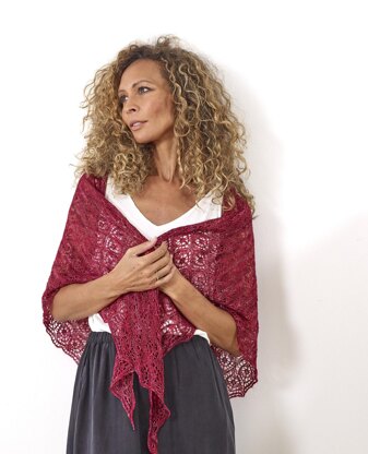 Leticia is a beautiful shawl with a combination of two delicate flower patterns. This shawl is worked from the bottom up with a floral lace pattern along the side edges of the shawl and a different lace pattern in the centre. The lace patterns are provided as charts and written instructions.