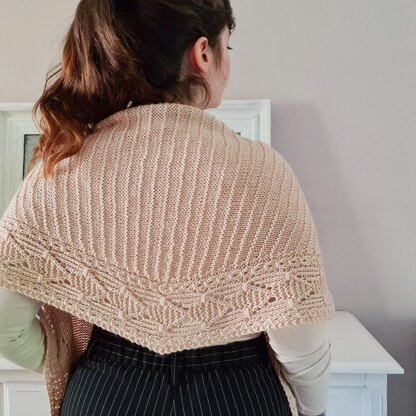Lettie is an elongated triangle shawl worked sideways. It features a graphic lace border and purl texture lines at the center. With its simple construction, it can be adjusted to any desired size, using any amount of yarn. Pattern provides charted and written instructions as well as video tutorials for special techniques in the lace, making this an accessible and relaxing project.