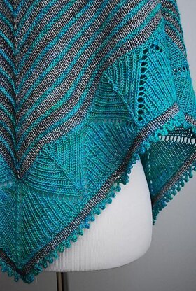 Leventry is a sophisticated shawl worked in two colors of fingering weight yarn. Starting with a garter tab, the shawl is worked from the top down and begins with two-color stripes that combine the textures of stockinette and garter stitch. The lower portion is highlighted by a band of geometric lace, and the border is finished with an additional stripe of color and a lacy picot bind off. Roughly 400-420 yds./366-384 m of each color is needed for this shawl. The sample used less than one skein of each color of the recommended yarn. To knit this pattern, you need to know how to do a provisional cast on and pick up stitches along a garter edge (for the garter tab), knit and purl when working flat, do directional increases, work lace stitches from a chart or written directions, do a centered double decrease, and do a cable cast on (for the picot bind off). The lace portion of this shawl is both charted and written. This pattern has been test knit and tech edited.