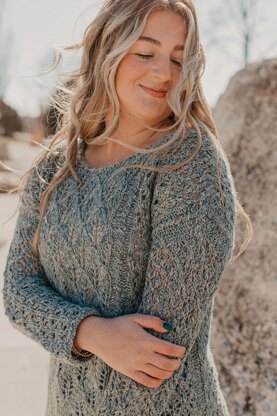Different lace patterns open up this boxy drop-shoulder pullover to keep it airy, loose, and comfortable. It’s a good layering piece for milder weather, knit in a merino/linen blend.