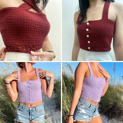 Lexi is a sleeveless button-up, reversible top / dress with a square neckline on one side, and a cross neckline on the other side. This is a made to measure pattern that does not have a fixed gauge. If you do your top in Style #2, you’ll need to measure your own gauge and use it for waist (and optionally, hip) shaping