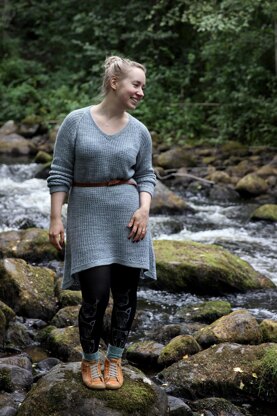 An elegant knitted dress with long sleeves. This stylish V-neck dress with raglan sleeves is easy to make and the broken ribbing gives the fabric lovely character. You can never have too many dresses, right?