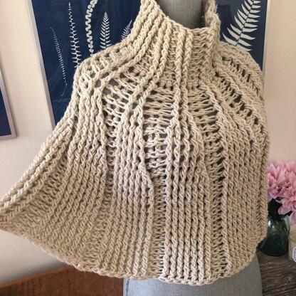 This super cozy capelet is REVERSIBLE and works up fast by using two different sized crochet hooks. It is crocheted in the round from the top down for the body and the cowl is created by picking up stitches around the neckline. Or omit the cowl for a different look!