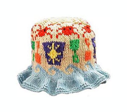 This is a great beach hat, summer hat, anytime hat! This cute cap features a ruffled brim, colorwork with a beach them. This is not a pattern for the true beginner, but if you'd like to practice your colorwork techniques, this is for you. The charted design is in full color. You will need to know how (or be willing to learn!) to knit in the round. The hat shown is knitted with Tahki's Cotton Classic, a nice dk weight 100% cotton. You can substitute another dk weight yarn, if desired.