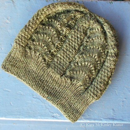 Construction: Knit in the round from the bottom-up, Light Street is beanie featuring columns of fans and twisted stitches.