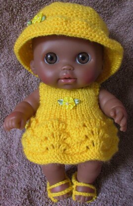 Easy to make dress set for the Berenguer Li'l Cutesies Doll. Instructions are for dress, hat, panties and sandals. The patterns uses 50g of DK yarn and 3mm needles. The instructions are written in UK terms. The skirt has a fan and feather pattern which is easy to do. An ambitious beginner could make this with patience. An experienced knitter could make this set in a couple of evenings.