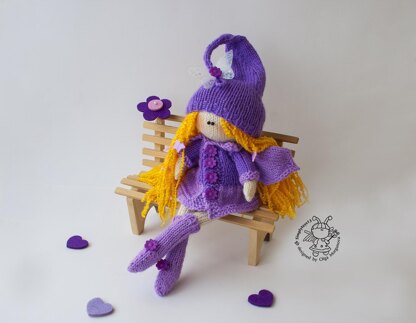 The finished doll is approximately 12,2 inches (31 cm) tall. The pattern includes instruction and pictures how to make this girl, her hairstyle and clothes. The clothes are taken off. Materials needed • 4 double-pointed needles in a size suitable for the yarn weight you are using. I recommend using needles a size or two smaller than the yarn calls for, to produce a firm fabric. İ used Needles size 2,5 (3mm) for doll, size 4 (3,5mm) for clothing. • Cream acrylic yarn (Kartopu «Flora» 100% acrylic 100 g-230 m) for doll • Yellow silk bouclé yarn by Zauberwiese Sport / 5 ply 100% Silk 149 meters / 50 grams • Lilac, violet colored yarn (Kartopu «Flora» 100% acrylic 100 g-230 m) for hat, dressб socks • Plastic tube length of about 10 cm. (For attachment of the head, neck and body together) • Toy stuffing • Yarn needle • Stitch holder • 8 Buttons for the dress, hat, socks • Stars for wig decor