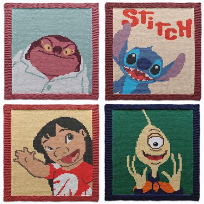 Bring the mischief and aloha spirit of Lilo & Stitch to your knitting with this cute set of four character blocks! Includes Stitch, Lilo, Dr. Jumba Jookiba, and Agent Pleakley — each square shows their fun personality in a cozy design. Worked flat with a neat garter border and smooth stockinette center, these blocks are perfect for kids’ blankets, pillows, tote bags, wall hangings, or as cute accents on sweaters. Combine all squares for a themed blanket or mix them in your favorite projects. Each block comes with a clear color chart and row-by-row instructions for intarsia or duplicate stitch, and you can adapt them for machine knitting too. Finished size depends on yarn/needles: Sport (5 ply): ~37×37 cm ~120 g; DK/worsted: ~46×46 cm ~140–180 g; Aran: ~52×52 cm ~250 g. Gauge: Sport 22×32 sts, DK/worsted 18×26, Aran 16×23 per 10 cm. Language: English. Let Stitch and friends brighten your next knitting adventure!