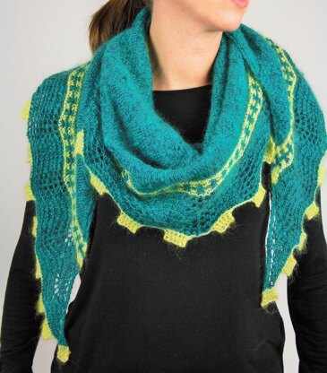 Lime Dance is a lightweight shawl featuring the sumptuous ITO yarns, combining mohair, silk, wool and paper into an exquisite accessory. You will work a stocking stitch body that is broken through by eyelet elements and topped off by a stripe introducing a striking contrast colour in a mosaic pattern. The undulating Feather and Fan pattern of the edging bends the stripe into a playful wave that some lemon coloured picots are dancing on.