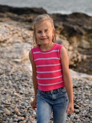 The garment is knitted in stockinette stitch with stripes in contrast colour.