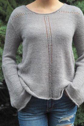 Knitted seamlessly from top down using continuously set in sleeve French shoulder constructions. Some simple lace added to the back and to the front to keep knitting entertaining. Sleeves worked to down - fitted at the beginning and have little flare to the end that creates romantic look.