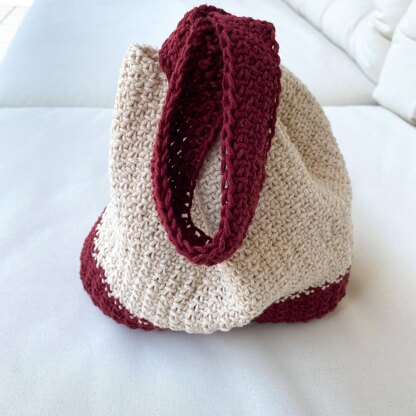 A simple bag that is knit top down and in the round, with linen stitch. Decreases are made near the bottom of the bag for a slightly curved bag base. Live stitches are bound off and the seam runs through the center of the bag base. Stitches are picked up for the two bag straps.