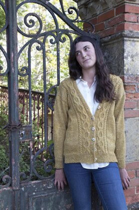 A classic V-neck, longer length cardigsn with a cable panelbordering the button band on eah front. It has a split hem with the back rib 8 rows longer than the front ribs.