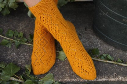The socks have front and back panels featuring a diamond lace pattern and side ladders lace pattern. The socks knitted in fingering weight Amble yarn from The Fibre Co. have a traditional heel- flap and gusset heels and are knit cuff-down, starting with a 2x1 rib. Separate charts and instructions are written for each size to make it easier to follow the pattern.