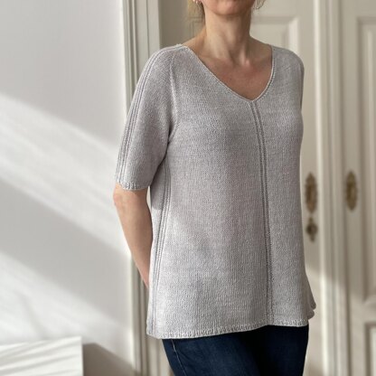 LiRi Tee is the abbreviation for Linen Rib Tee. It’s a sporty V-neck tee, primarily worked in Stockinette Stitch with ribbed details at the sleeves, the center front, and at the sides of the lower body, which provide variety. The tee is worked top down in one piece to the neck in rows, then completed in the round.