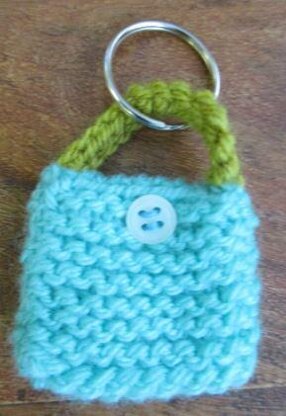 This is a pattern for Little Bags keyring. There are three versions of the pattern; moss stitch, garter stitch and stocking stitch. They have embroidery or button decoration, and are attached to a keyring. It is a good way of using up small amounts of yarn.