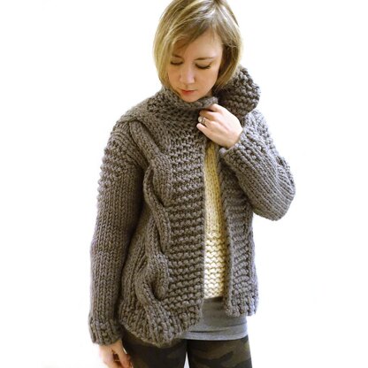 This fitted, chunky cardi will actually flatter! Lighter weight than most chunky-bulky knits, this Little Bomber Cardi will be comfortable and look great on; a piece you will actually wear! With beautiful cables running up the fronts, Garter Stitch motifs on the sleeves and back and a stunning shawl collar, this cardi is full of thoughtful details. Simply a joyful quick knit!