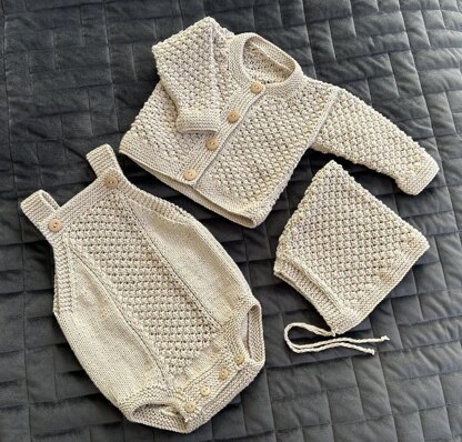 Instructions are given for the cardigan in three sizes 0-3 mths, 3-6 mths and 6-12 mths, for the rompers in four 0-3 mths, 3-6 mths, 6-9 mths and 9-12 mths. The rompers are knitted bottom up. The back and front are worked to the top of the leg openings as separate pieces and are joined to knit the body in one piece. The front and back arethen worked separately to form the front and back bib sections. Once the side seam is completed, stitches are picked up around the leg openings to work the leg borders. The cardigan has minimal shaping, a careful watch on the number of stitches on each row during shaping (decreasing and increasing) must be maintained as it’s easy to make mistakes. Instructions are provided for the bonnet in two sizes, 0-6 months and 6-12 months. This pattern is suitable for an intermediate knitter. To knit the bonnet you will need 1 (170m) ball, to knit he rompers you will need 2-3 balls depending on the size and to knit the cardigan you will need 2-4 balls.