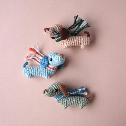 Amigurumi crochet pattern for a Little Dachshund with a stripy scarf. This project was part of Amigurumi Advent 2019, discover the full collection by Airali design and Irene Strange. This pattern is written in US crochet terms, with plenty of step-by-step images to guide you along the way. This is an easy project that uses a very small amount of yarn!