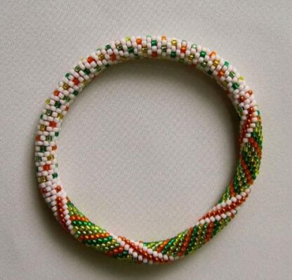 This is a bead crochet pattern that features three different patterns in one bangle. It is one of the easier bangles patterns that I have listed in my shop. This is a result of the fact that the bangle is crocheted 8-around and is made using all size #11’s. The bangle is made using the slip stitch method of bead crochet. It is finished with the invisible join.
