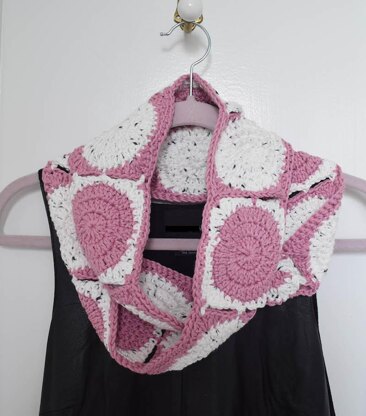 Simple circle-in-a-square motifs are connected with the join-as-you-go method to create a bold infinity scarf to brighten your day.