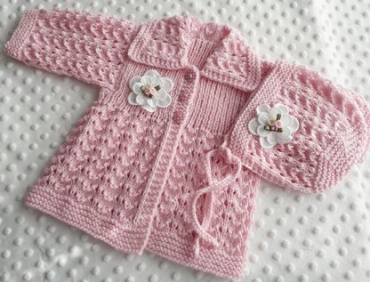The little bonnet is very pretty and very easy to knit. An embellishment has been added to the coat and bonnet but this is optional and the garments can be left plain or any other embellishment can be added. I found my applique/embellishments on eBay.