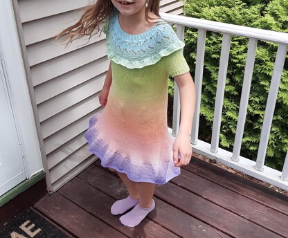 Ruffles, bobbles, lace - this dress has it all! A companion pattern to my adult Fiesta Top, Little Fiesta is just as charming and fun to knit. Simple top-down construction allows you to customize this pattern to be a top, tunic, or a dress. Options for omitting lace and bobbles, or adding long sleeves is also included. Perfect for long-gradient yarns, or any Fingering weight yarns, this dress can be made for any season.
