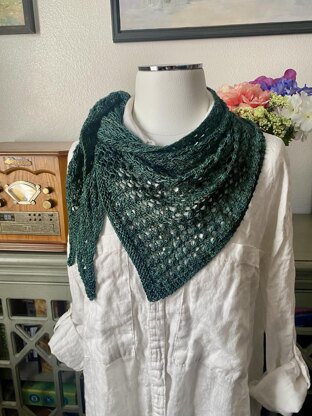 Finished Dimensions: Approximately 50 inches wide and 15 inches from top to bottom tip. Wet blocking is highly recommended to open up the stitches and achieve final dimensions.