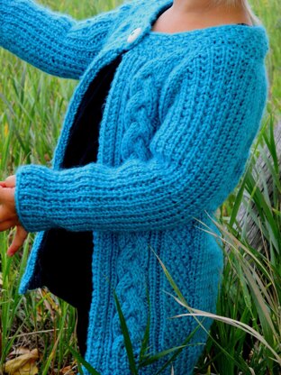 This raglan cardigan is knit from the top down and is completely seamless. It is an interesting knit that will keep you on your toes, but is so worth it! It features broken rib stitch, moss stitch and cable patterns.