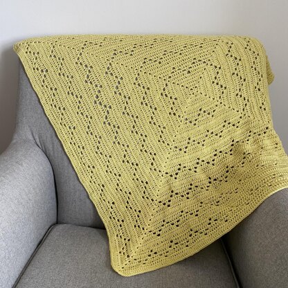 The blanket shown used one 3 x Scheepjes Whirlette (4ply, 60% cotton, 40% acrylic, 100g/455m) in Star Fruit (870) and this made a blanket approximately 88 x 88cm.