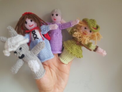 Knitting pattern to create finger puppets for the story Little Red Riding Hood. The pattern includes instructions to create Little Red Riding Hood, Granny, Wolf and the Woodcutter.