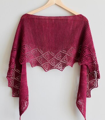 Here is a fast, fun sideways garter and lace shawl. The pretty lace pattern is worked along with the garter stitch body. Any amount of yarn may be used and one skein is always enough. Pick a pretty summer colour and work this one up in the garden with a cup of tea. Quick, before summer comes to an end! Pattern includes notes, list of abbreviations, diagram, and written as well as charted instructions. Skills required: increasing, decreasing, knitting lace, blocking lace. Stitches used: k, p, sl kwise wyib, k2tog, kfb, SK2P, ssk, yo.