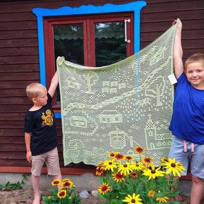 The Little Village Curtain is a lace square worked down top, back and forth in rows, using filet crochet technique: only double crochet and chains, no colorwork, no complications! Just follow the chart for an idyllic village scene to decorate your window. Use any yarn you wish, pattern is written for sport weight (finished size:125cm wide x120cm long/49x47”) and lace weight: 86 cm wide x 81cm long/34”x32”