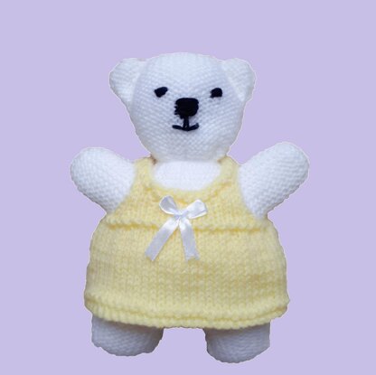 This is a hand knit PATTERN for a small teddy bear, easy to knit in reverse stocking stitch. The pattern includes a dress and panties for teddy.