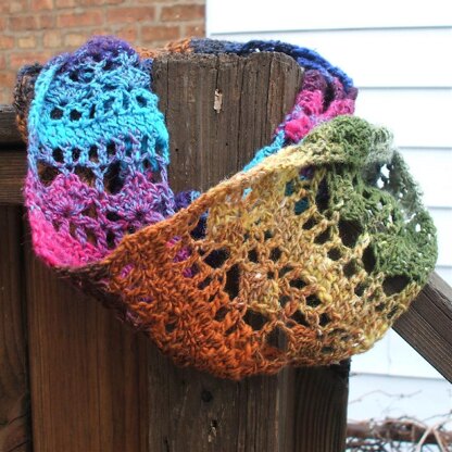 Here's a stylish and pretty infinity scarf to show off your favorite self-striping yarn. Instructions for using either DK or Bulky weight yarn are included. This is a quick pattern to make, especially if you use bulky weight yarn.