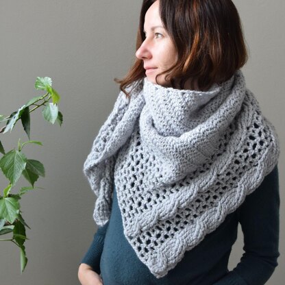 The shawl is slightly asymmetrical with chunky cables combined with lace parts.
