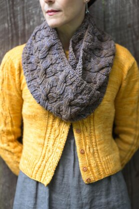 Lizzie is the ultimate accessory for cooler weather. Its pretty, meandering and syncopated cables are completed with a quaint seed stitch and rib border. Whether you make it long or short, wear it wrapped for warmth or loose for decoration, it adds that finishing touch to any outfit. Lizzie was designed with Malabrigo Twist, a marvelous 8-ply yarn that is as wonderful to knit with as to wear. This cowl will hang around with you all autumn.