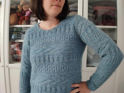 Yarn : This sweater is knitted with 2 threads held together. One DK yarn (La plus fine from Atelier Pure Laine) + one mohair lace yarn (Kid Silk from Drops) = Worsted weight. Approx. 760, 850 (940, 1030, 1120) 1210, 1300, 1390 m of **each yarn.**835, 930 (1030, 1130, 1225) 1325, 1425, 1520 Yards of each yarn.