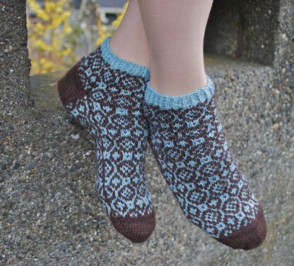 A toe-up stranded color work sock with shaped arches and short row heel.