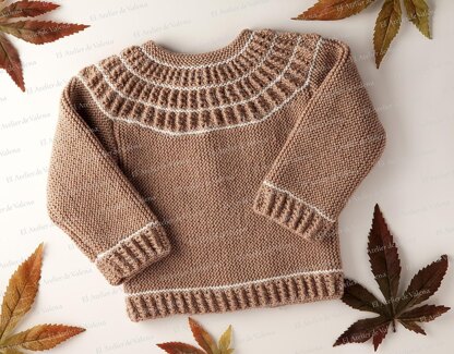 Product for digital download containing the instructions to make a warm woollen sweater for a baby of 2 to 3 months, knitted in dusty pink and trimmed with white stripes. The instructions include the description of all the materials required to make the garment and the needle size used.